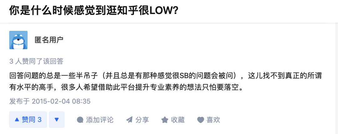 最初,用户们可以在知乎上看懂苏联解体的原因,甚至是掌握“原子弹的制作:从入门到精通”。但后来,登上热榜的问题中开始出现“普通人如何正确解锁一段恋情?”“你遇到过什么很恶心的事和人?”虽然这些话题也会激发人们的好奇心和求知欲,但知识性略显苍白,更像是高校BBS论坛和百度知道里才会有的内容。没有了“精英”氛围的加持,只剩下“社区”的知乎,也失去了商业化的亮点。