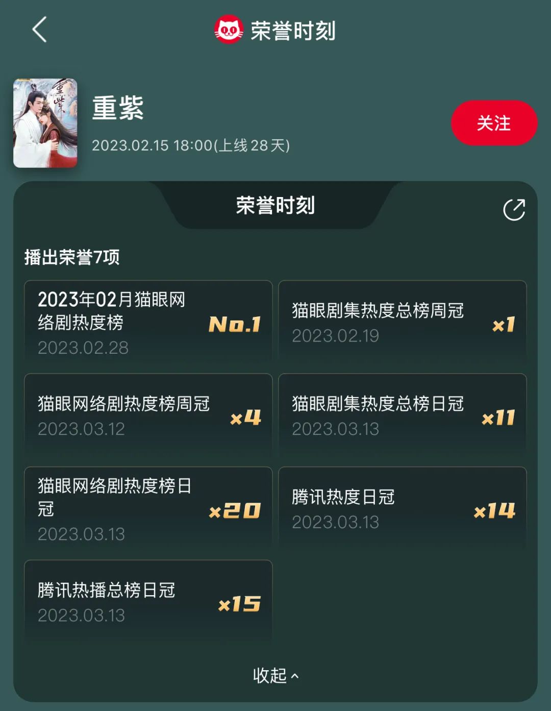 复盘《重紫》的数据,可以明显看到一条逆势上扬的曲线。上线29天内勇夺猫眼网剧热度榜日冠20次,腾讯热度日冠14次、腾讯热播总榜日冠15次。全网上榜热搜910条,抖音话题播放量17.92亿,微博话题阅读量183.21亿。尤其异乎寻常的是,豆瓣评分收官时比开分时还涨了0.2分。如此能打的表现,在同期剧集中可谓一骑绝尘,堪称隐形剧王。