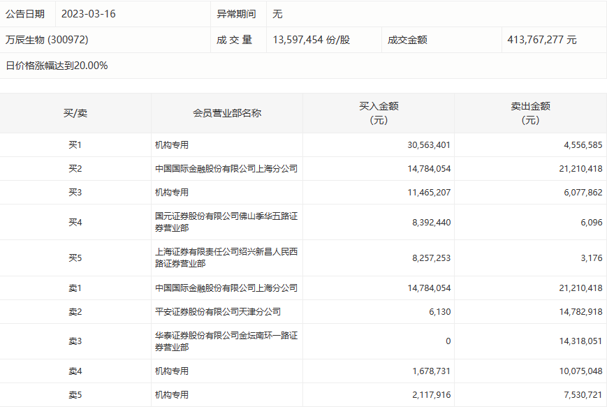 3月16日,万辰生物今日涨停,龙虎榜数据显示,上榜营业部席位全天成交1.56亿元,占当日总成交金额比例为37.66%。其中,买入金额为7726.51万元,卖出金额为7856.09万元,合计净卖出129.57万元。