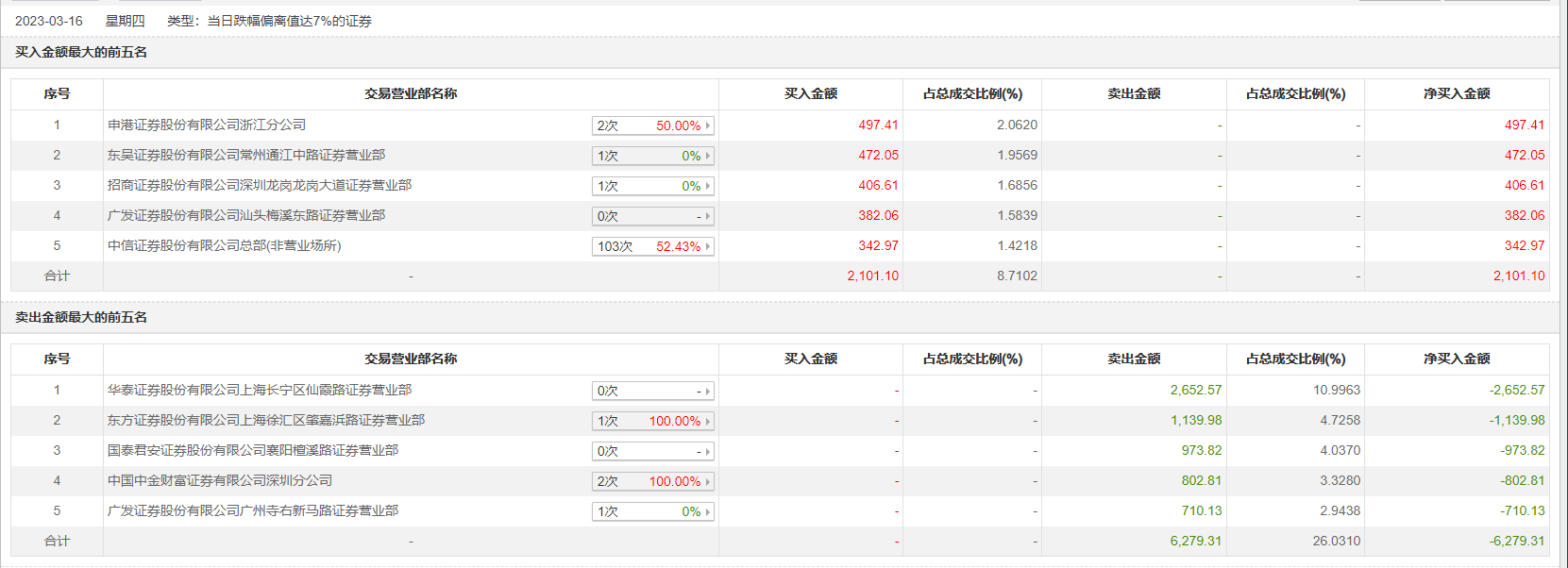 具体来看,华泰证券上海长宁区仙霞路证券营业部、东方证券上海徐汇区肇嘉浜路证券营业部分别卖出2652.57万元、1139.98万元;申港证券浙江分公司、东吴证券常州通江中路证券营业部分别买入497.41万元、472.05万元。