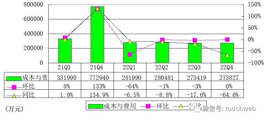 2022年第四季度,不按照美国通用会计准则计量,成本和支出为26.483亿元(约3.840亿美元),比上一年同期的32.058亿元减少17.4%。