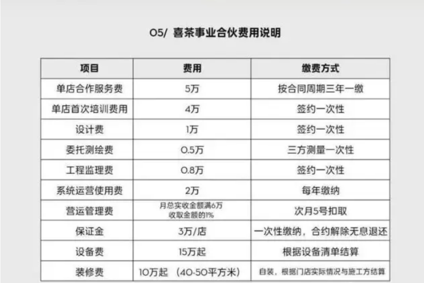 先看加盟所带来的短期收益。不得不说,跟其它茶饮品牌相比,喜茶的加盟费实在不便宜,光第一年需要缴纳的费用就高达41.3万元。