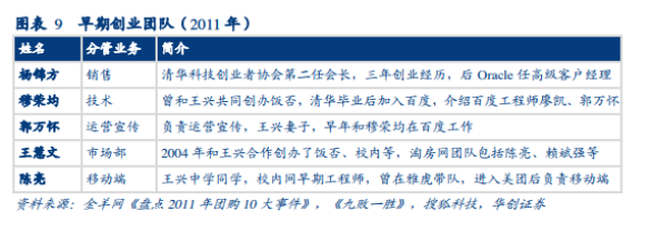 王兴带领的早期创业团队包括:杨锦方、穆荣均、郭万怀、王慧文、陈亮。他们或是在此前就跟随王兴创业校内网、饭否网的“元老”,或是成立美团后拉来的新人。