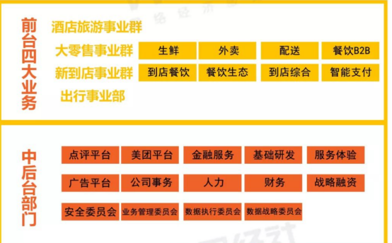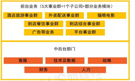 公司分为前台业务和中后台部门,前台业务为核心,包括:酒店旅游事业群、外卖配送事业群、到店餐饮事业群、到点综合事业群、平台事业群这5大事业群和猫眼电影子公司以及广告等业务板块,由多数原高管坐镇。中后台部门,则留陈亮和穆荣均管理。