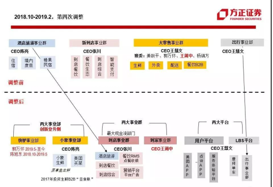 新到店事业群由张川担任总裁,整合了原到店餐饮、餐饮生态、到店综合、智能支付业务。大零售事业群由王慧文任总裁,实行班委制度。酒店旅游事业群,由陈亮继续任总裁。新成立的出行事业部由王慧文负责,试水打车业务,与滴滴展开竞争。
