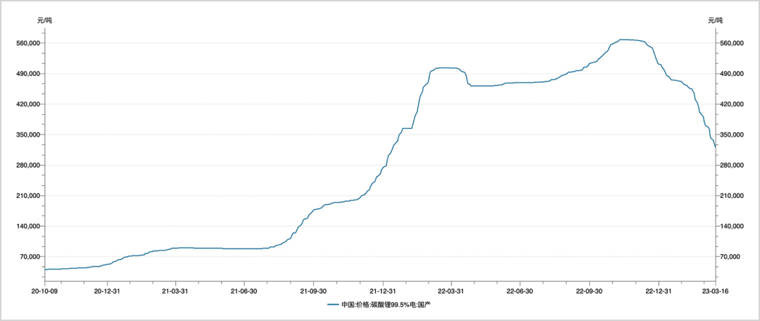 事实上,自2023年以来,锂价已经进入下行周期。最新的报价显示,碳酸锂(99.5%电池级/国产)平均价已经跌破33万元/吨,距离高点已削去了超过四成。