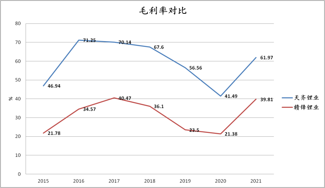 赣锋锂业的锂矿主要用于自供,目前自给率只有40%左右,而天齐锂业家境富裕,不仅原料自给率达到100%,还可直接对外出售锂矿石。也因此,赣锋锂业的利润率一直做不过天齐锂业,且当锂进入上行周期后,拥有更多上游资源的天齐锂业的盈利弹性天然好于赣锋锂业。