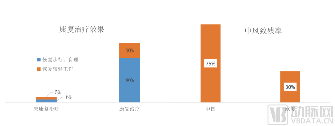 另一方面,《脑卒中康复治疗的护理配合》显示,康复治疗可以使90%的脑卒中患者恢复步行和自理生活,使30%的患者恢复较轻的工作;若不进行康复治疗,仅有6%恢复步行和自理生活,5%恢复较轻工作。