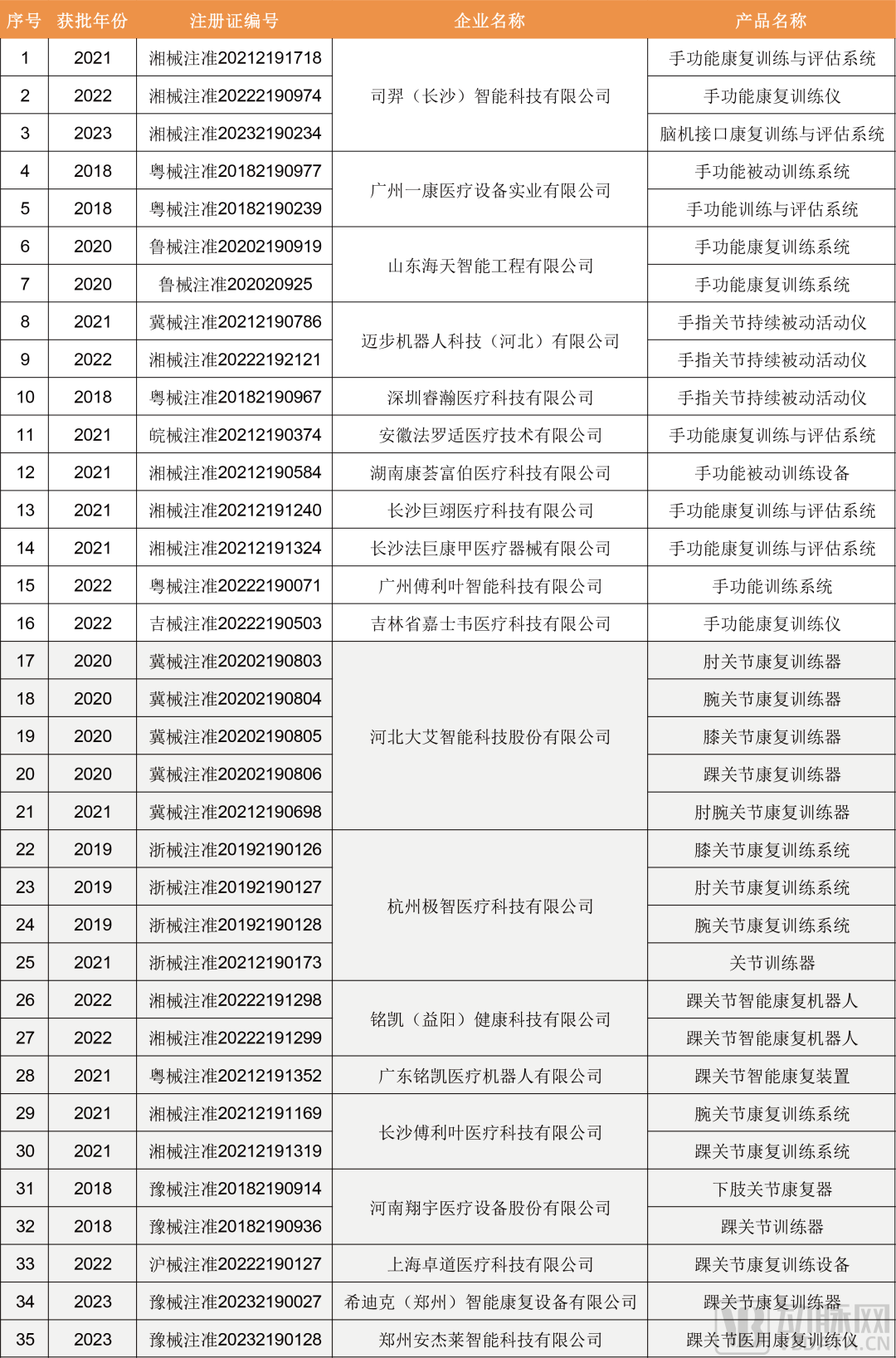 下肢、上下肢康复机器人与相关产品获批盘点,图片来源:NMPA,蛋壳研究院制