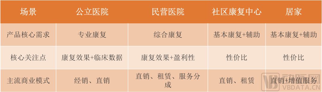 从产品的角度分析,产品的功能、适用的人群、各场景资源等影响其商业模式。我们综合康复阶段与主要场景,对现有主流商业模式做梳理如下: