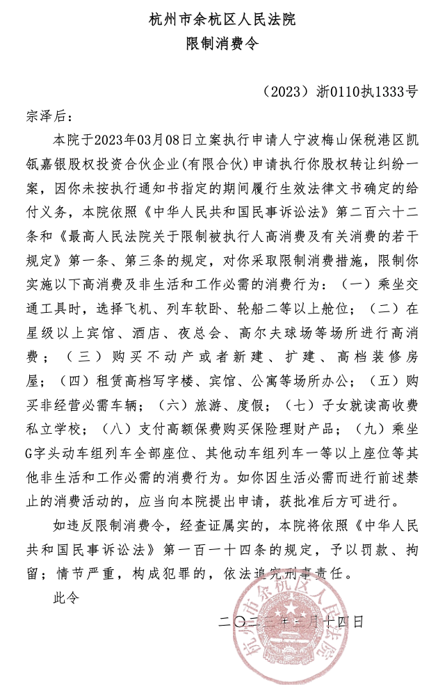 据中国执行信息公开网,3月14日,杭州市余杭区人民法院向宗泽后下发限制消费令。该法院于2023年3月8日立案执行申请人宁波梅山保税港区凯瓴嘉银股权投资合伙企业(有限合伙)申请执行宗泽后股权转让纠纷一案,因宗泽后未按执行通知书指定的期间履行生效法律文书确定的给付义务,该法院依照规定,对其采取限制消费措施。据悉,宗泽后为娃哈哈集团创始人宗庆后的弟弟。