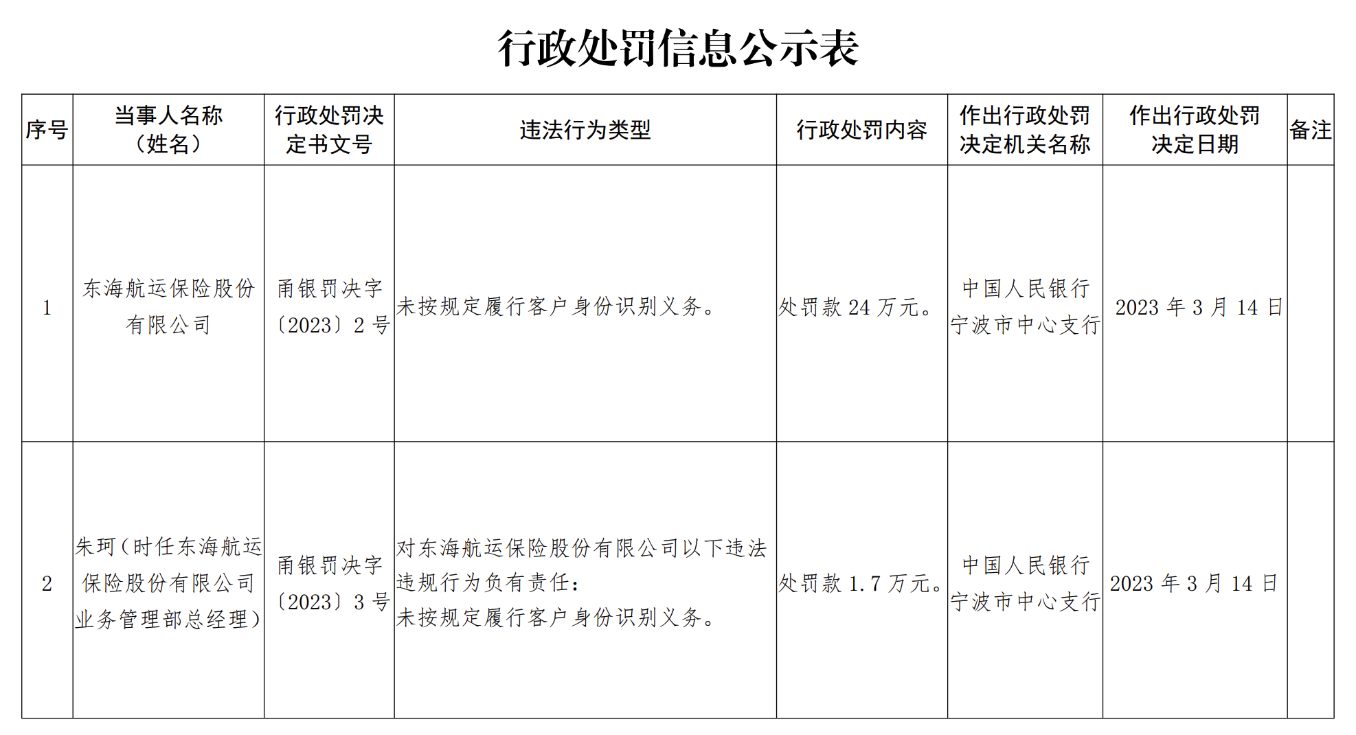 3月17日,中国人民银行宁波市中心支行行政处罚信息公示表显示,2023年3月14日,东海航运保险股份有限公司因未按规定履行客户身份识别义务,被处罚款24万元。时任东海航运保险股份有限公司业务管理部总经理朱珂对上述违法违规行为负有责任,被处罚款1.7万元。