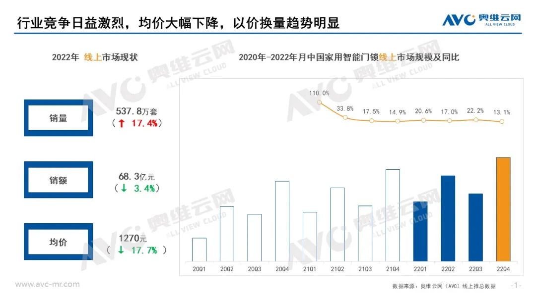 2022年依旧是疫情管控的一年,智能门锁行业却依旧保持高速增长态势。据奥维云网(AVC)线上推总数据显示,2022年中国家用智能门锁线上市场销量为537.8万套,同比增长17.4%;销额为68.3亿元,同比下降3.4%;均价为1270元,同比下降17.7%;
