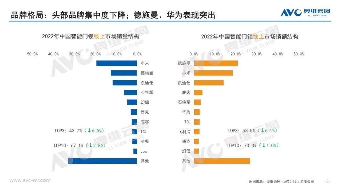 目前,我国智能门锁的渗透率依旧较低,仅10%左右,相较于日韩以及欧美国家仍存在较大差距,随着行业的持续普及和消费者对智能门锁的接受度逐渐走高,行业正在向“刚性需求”转变,面对增长空间如此巨大的市场,众多品牌争先加入这一赛道。随着竞争的加剧,行业品牌格局也发生一定变化,据奥维云网(AVC)线上监测数据显示,2022年TOP10品牌销量份额为67.1%,对比同期下降2.8%;销额份额为73.3%,对比同期下降1.0%。