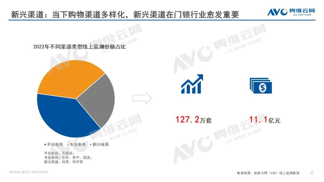 近几年,直播/短视频带货潮流依然强势,淘宝、抖音、快手等直播平台因其流量巨大越来越受到企业的重视,并给予了这一渠道更多的资源倾向。据奥维云网(AVC)线上监测数据显示,2022年抖音、快手等新兴渠道占线上市场监测销量的近25%,整体销量为127.2万套,销额11.1亿元,抖音、快手等新兴渠道已然成为了智能门锁线上市场的重要推动力。