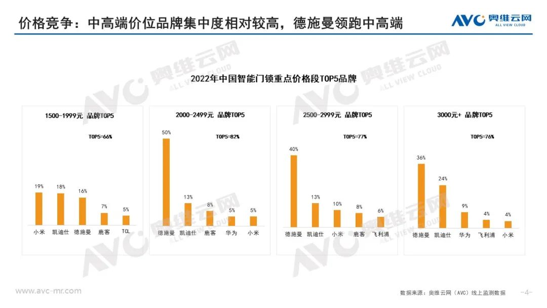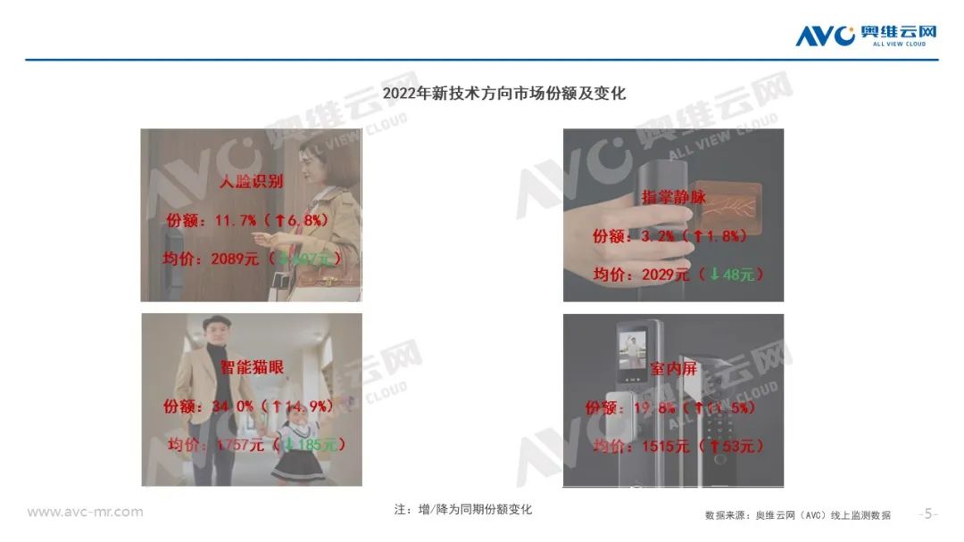 据奥维云网(AVC)线上监测数据显示,2022年人脸识别销量份额达到11.7%,较同期份额增长6.8%,均价2089元,较同期下降607元,人脸识别已成为行业重要竞争赛道,目前德施曼引领人脸识别赛道,凯迪仕紧随其后,并不断拉近差距;