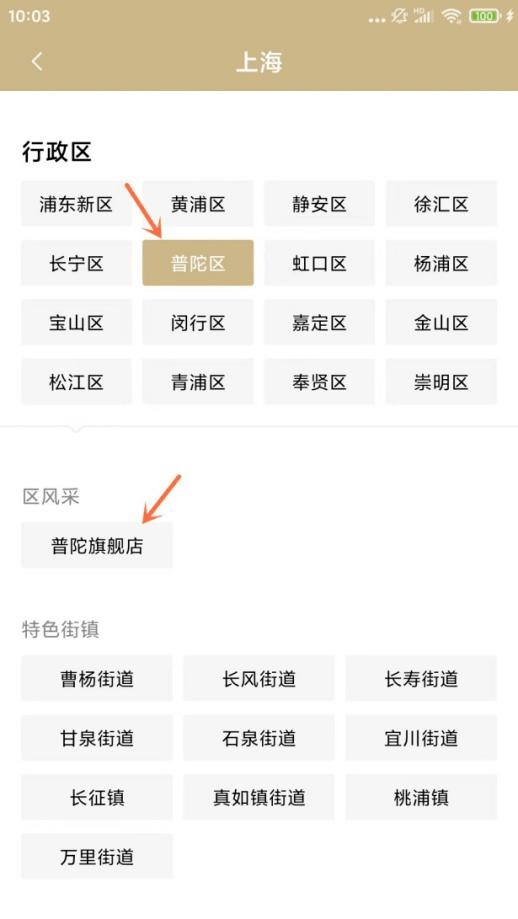 2、切换至“发现”频道,搜索框“上海”-找到“普陀旗舰店”,点击进入区主页