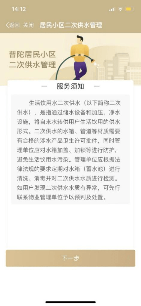 生活饮用水二次供水(以下简称二次供水),是指通过储水设备和加压、净水设施,将自来水转供用户生活饮用的供水形式。二次供水的水箱、管道等材质需要有合格的涉水产品卫生许可批件,同时管理单位应对水箱加盖、加锁等进行防护避免生活饮用水污染。管理单位应根据法律法规的要求定期对水箱(蓄水池)进行清洗、消毒并对二次供水水质进行检测。如用户发现二次供水水质有异常,可先行联系物业管理单位予以预判及处置。