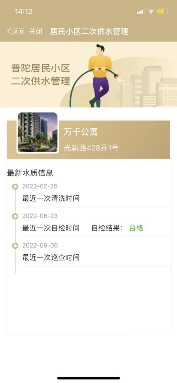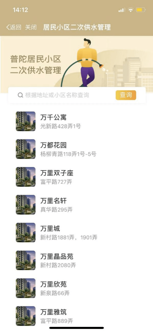 4、列表中查找或直接搜索自己所在小区、公寓,点击即可查询最新水质信息,如发现水质异常可先行联系物业管理单位