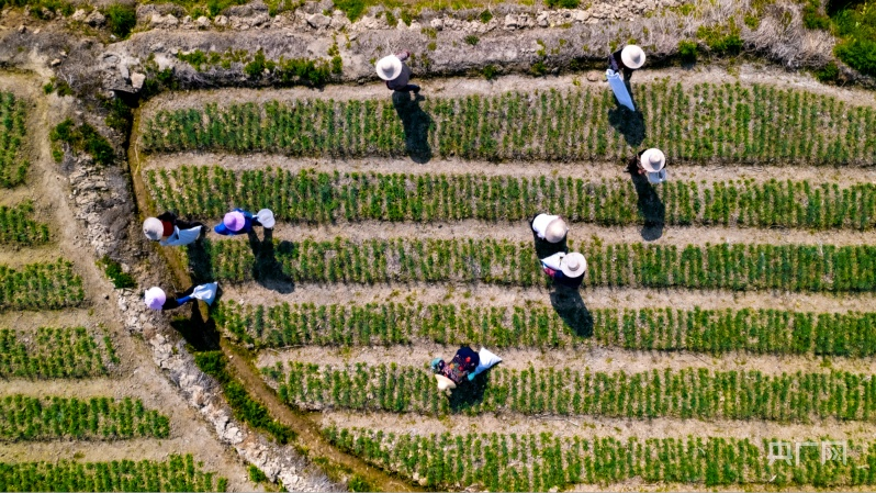 浙贝母花海中劳作的村民(央广网记者 俞烨 摄)