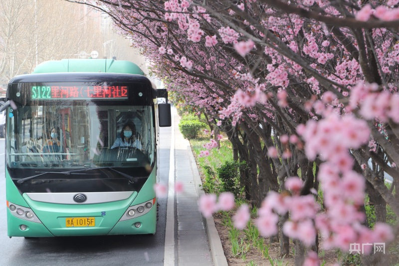 3月10日清晨,在河南省郑州市佛岗村附近,S122路公交车开入了花海。