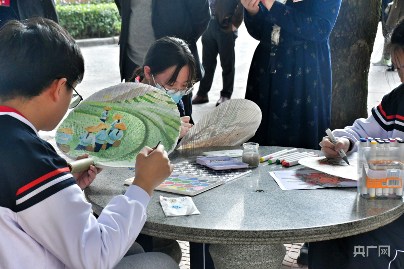官埔油扇学生社团的学生在油扇上画春之景(央广网记者 龚雯 摄)