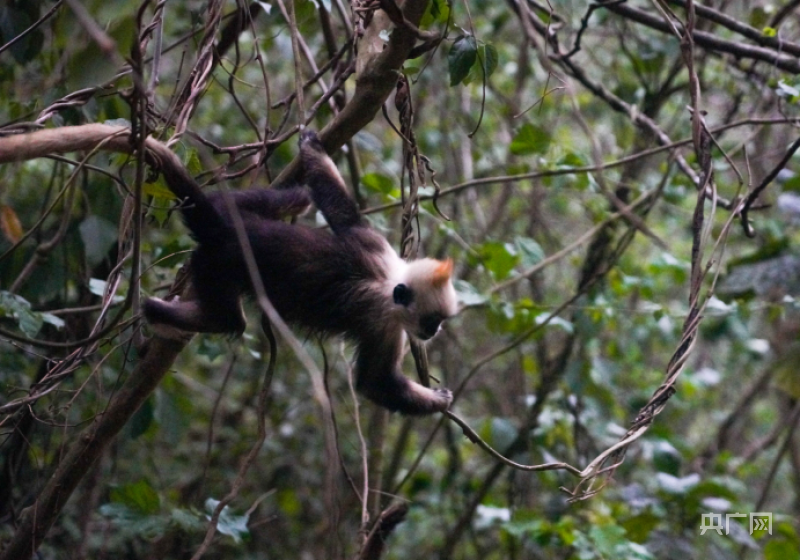 白头叶猴在树枝间“飞行”(央广网记者 黄月芬 摄)