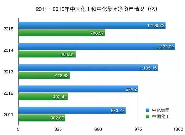 通过一些列的并购,中国化工借助资本的力量迅速做大,并进入了国际市场。截止2015年,中国化工海外企业资产总额占比由 9.37% 增长到 46.31%,销售收入占比由 12.91% 增长到 55.36%,中国化工的资产总额由229.6亿元增至3725.1亿元,是成立之初的16.2倍;主营业务收入由152亿元增至2602亿元,是成立之初的 17.1倍。