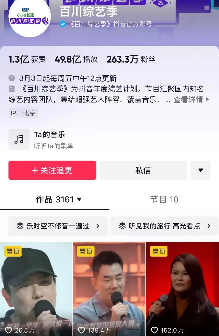 《百川综艺季》的阵仗很大,它被视为抖音今年在综艺上的重点方向之一,也是抖音在综艺内容领域的最新尝试。而在《百川综艺季》的六个子节目里,抖音也分了两部给到音综,《百川乐时空》更是其中的主打。