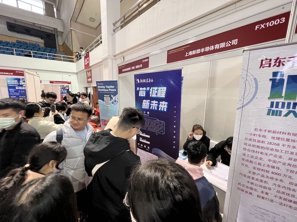 招聘会开始不到半小时,半导体企业盛吉盛半导体技术(上海)有限公司的招聘人员就收到了20余份简历。他们的招聘摊位前,甚至排起了小长龙。