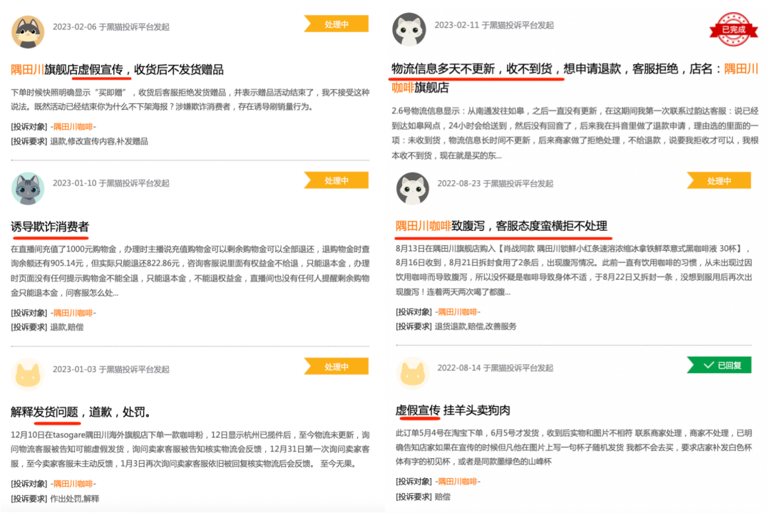 隅田川咖啡被投诉及商家处理情况 图源:黑猫投诉