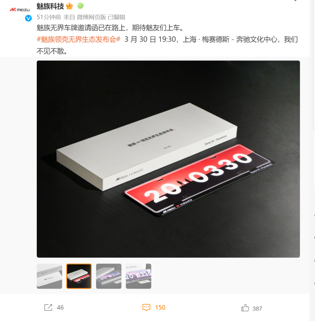 魅族科技先是在微博表示,“20年前,以热爱为起点,探索行业创新的孤勇先锋;20年后,以无界为彼岸,驶向融合赛道的全新征程。凡是过往,皆为序章。‘魅族领克无界生态发布会’未来可期。”随后,立即发出了发布会的邀请函,并配文,“魅族无界车牌邀请函已在路上,期待魅友们上车。”