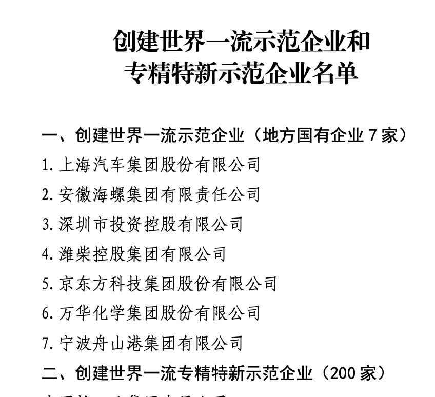 其中,7家地方国有企业入选创建世界一流示范企业名单,200家企业入选创建世界一流专精特新示范企业名单。