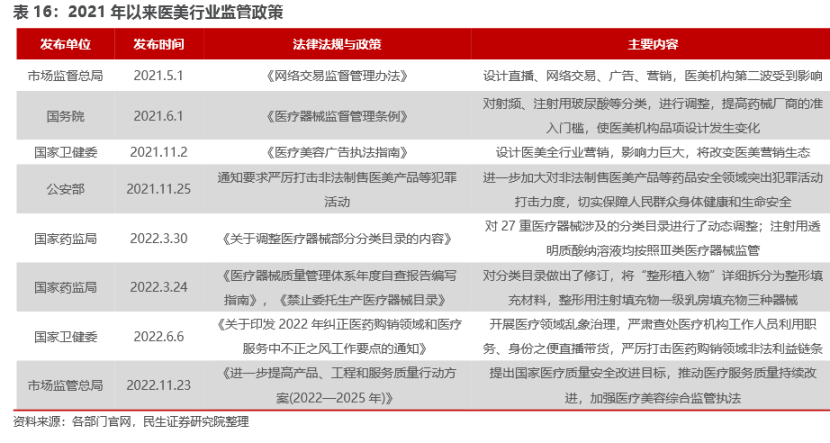 而中游的医美机构则需要足够的专业医疗人员去支撑服务质量,经营需要同取得经卫生行政部门登记注册的《医疗机构执业许可证》,且要有明确的医疗美容诊疗服务范围、符合医疗机构标准、有执业资格且具有一定工作年限的执业医师和注册护士。