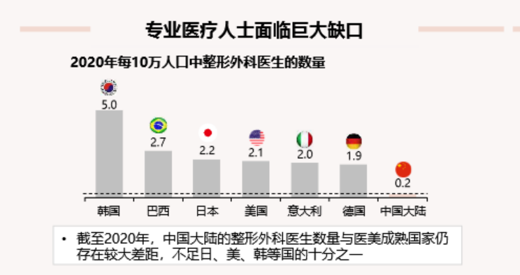 强需求和高门槛决定了当下行业无法为消费者提供足够的专业人才。根据《中国卫生健康统计年鉴2021》,2020年我国合计符合医美行业规范的专业医疗从业人员仅32,030人。