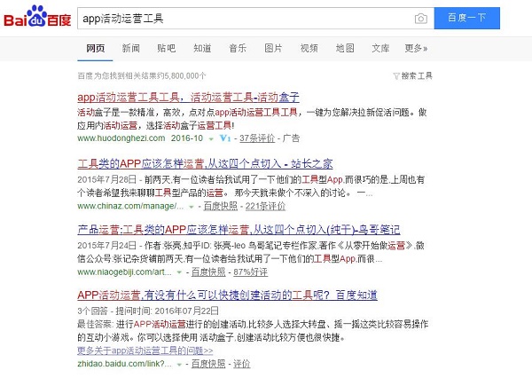 如下图所示,当我们在百度搜索“app活动运营工具”的时候,显示在最上面的有颜色区分且下面带有“广告”字样就属于PPC广告,只要有人点击,对应的广告主就要支付一定的广告费用。