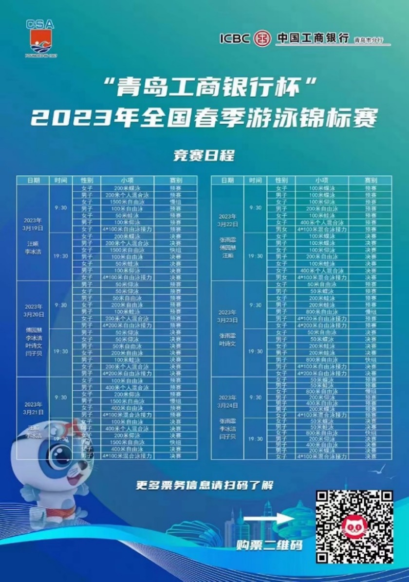 作为近两年来首个恢复开票的国家级游泳赛事,本次比赛在“猫眼”小程序或APP、“国信通”小程序、“青岛国信体育中心”抖音直播售票。同时,为普及中小学生游泳教育、推广游泳运动,比赛面向广大中小学生开放研学票,培养更多的游泳希望之星。比赛还将在蓝睛和爱青岛APP全程直播,中央电视台、新华社等国家、省、市级媒体全程跟踪报道。