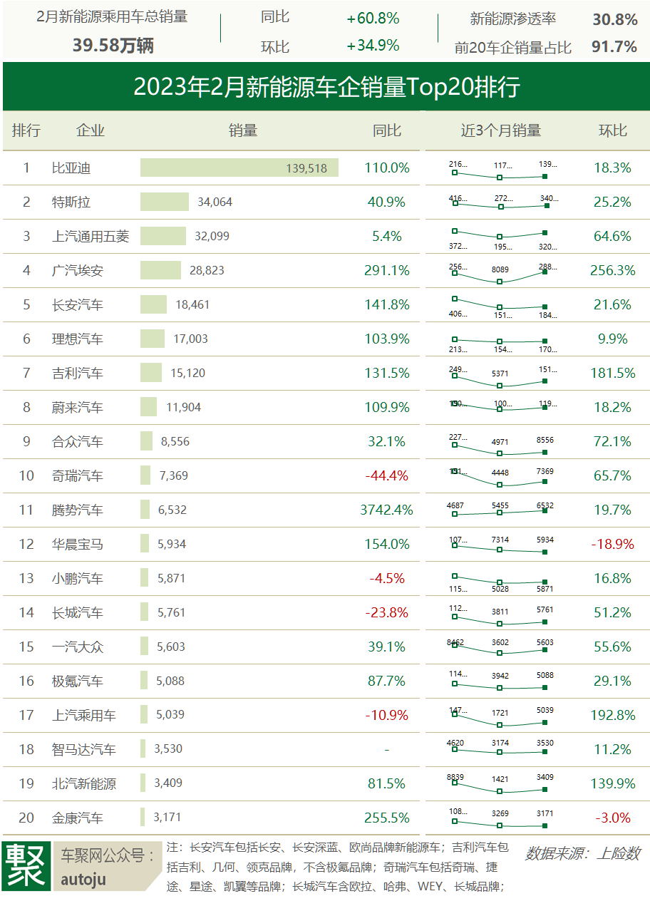 广汽埃安排名第四,28,823辆的成绩创其历史新高;同时,其291.1%的同比增长和256.3%的环比增幅,均位于榜单前列。经历1月的小低谷后,广汽埃安迅速攀升至巅峰,看来,2月官方推出的限时促销优惠活动效果显著。