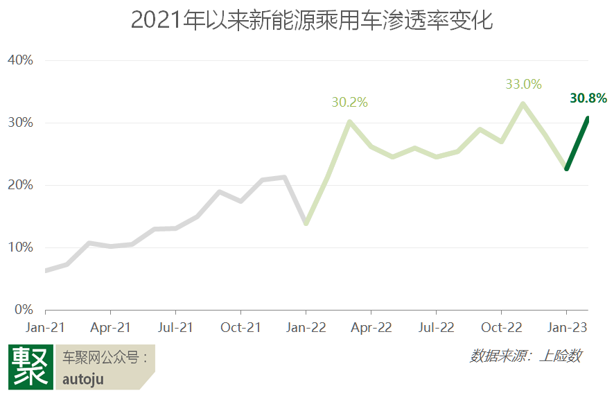 在当期乘用车中,新能源车2月渗透率达30.8%,这是历史第三次突破30%,也是历史第二高——仅次于2022年11月的33.0%。