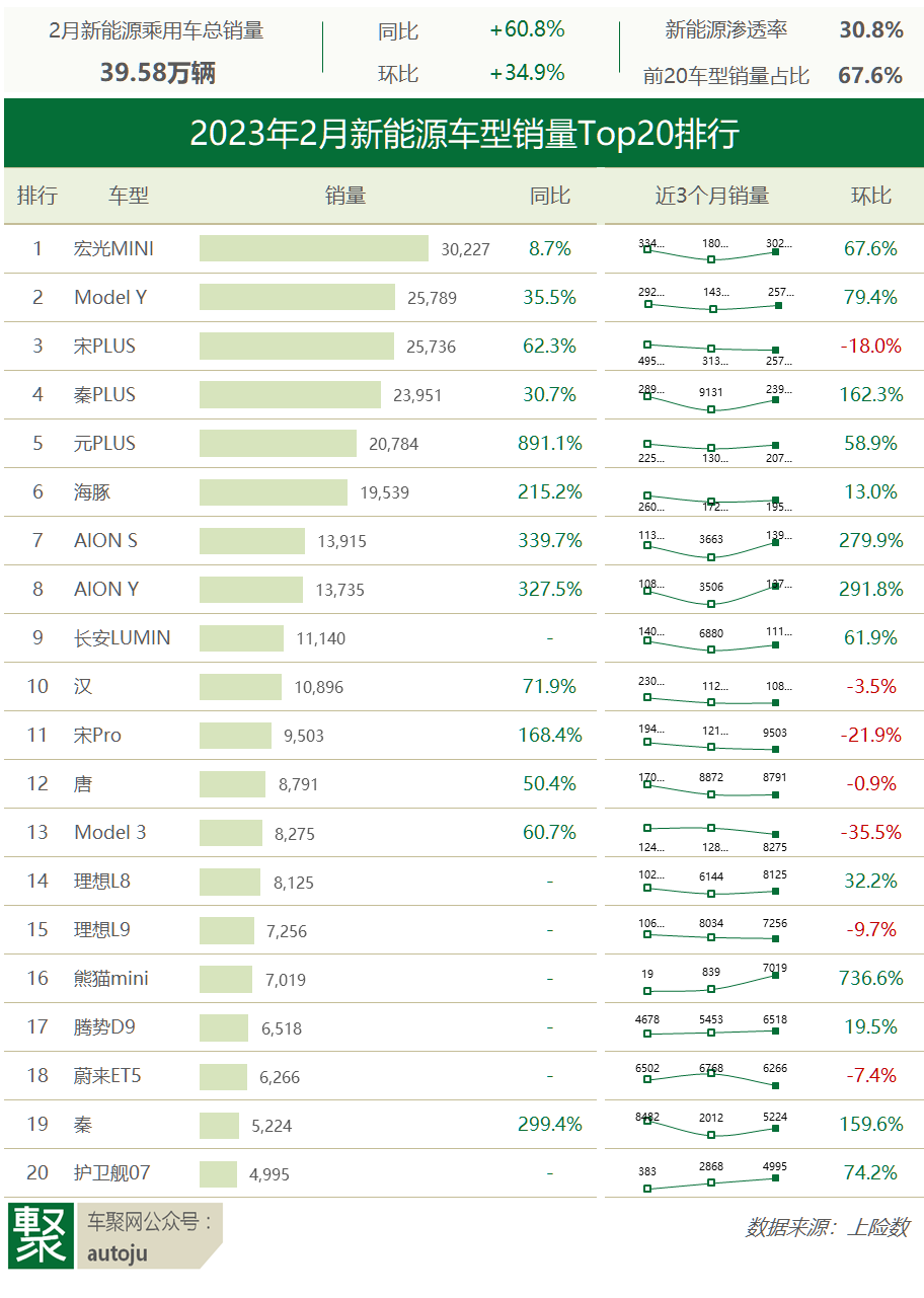 再看看车型榜。时隔三个月后,宏光MINI EV今年2月以3.02万辆的成绩重回冠军。看来,“老将”实力仍存,同时也说明车还是便宜的好卖。3万多的起售价,用车成本也低,挂绿牌,满足日常用车……选它,何乐而不为!