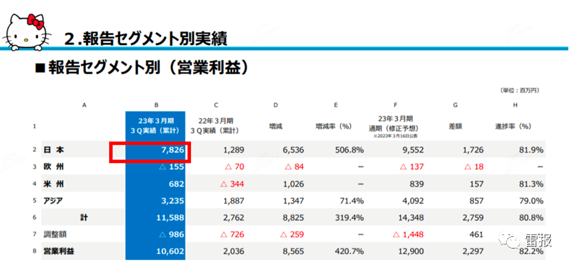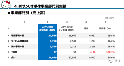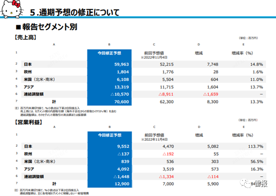 社会经济活动恢复正常化对三丽鸥日本国内业绩的恢复有着根本性的影响。外部环境方面,尽管欧洲冲突持续、物价上涨、金融和资本市市场尽管未来受汇率波动的影响仍不明朗,但三丽鸥的中期经营计划的结构改革带来销售成本占比的降低,长期亏损的日本国内产品销售业务和北美地区比预期的提前一年扭亏为盈。因此本财年第三季度(自然年Q4)累计综合业绩已经超过了上个季度对全年的业绩预测。