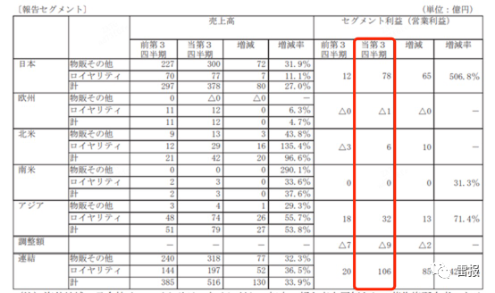 销售额的上升主要来自于日本国内和海外两个板块的都有亮眼的表现。日本国内及海外各地区销售额均有所增长,国内的商店和主题公园在过去整个季度的运营以及与其他公司的合作项目都顺利推进,客流量的增长带来了销售额的显著增幅。海外板块,除了北美电商业务的增长外,中国各品类的IP授权业务也仍旧表现强劲。
