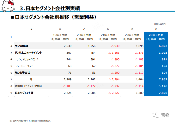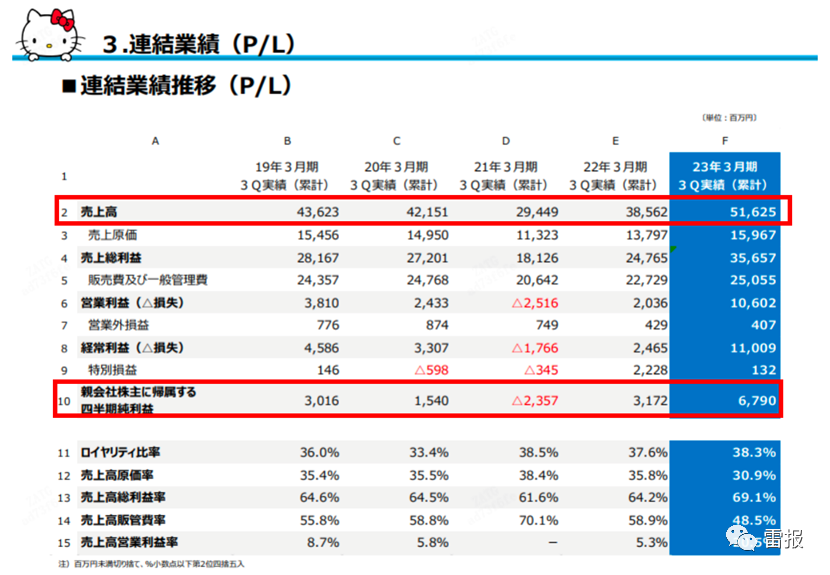 3月16日,日本知名公司三丽鸥披露了2023财年前三季度财报(自然年2022年第二至四季度,实际时间为4月1日-12月31日),雷报据此获悉:截止2023 财年 Q3,三丽鸥实现累计销售额516亿日元(约合人民币26.8亿元),较上年同期增长33.9%;归属于母公司股东的累计净利润为67亿日元 (约合人民币3.48亿元),同比增长114.0%。