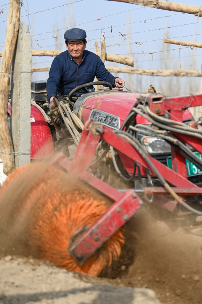 3月8日,在新疆吐鲁番市高昌区葡萄镇,农民操作开墩机在葡萄地里作业。新华社记者丁磊 摄