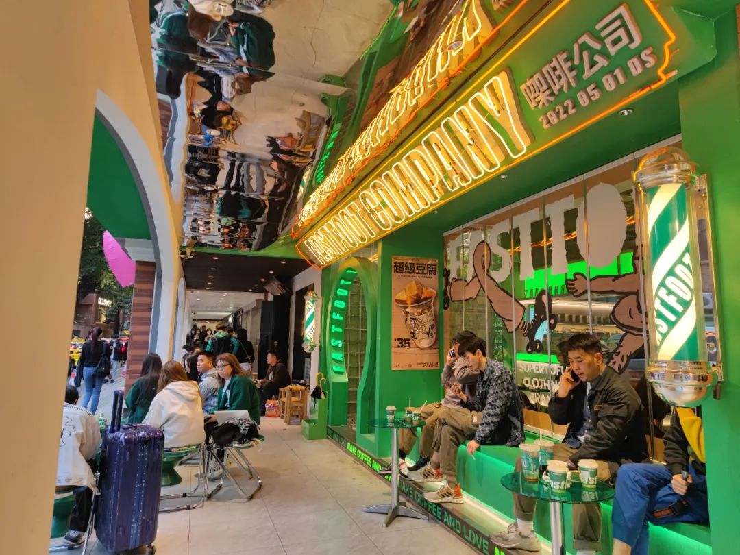 比如开在东山印象·一方东山一楼的fastfood急急脚咖啡公司,将标志性的荧光绿色装饰和复古风味十足的装灯作为门店标志,仿佛是老洋房建筑上的一处彩色画布,将新老元素融合得恰到好处。楼上的nR cafe则采用欧式简约复古风格的设计,进入店内彷佛置身中世纪欧洲咖啡馆中。