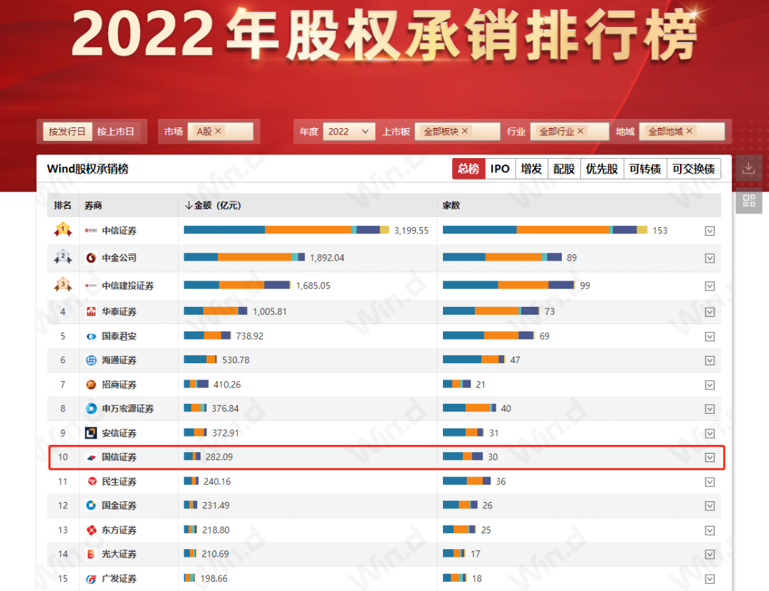 截至2022年末,国信证券承销数量30家,承销金额282.09亿元,位列第10。