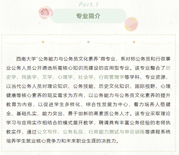 3月17日,西南大学历史文化学院官微发布“公务能力与公务员文化素养”微专业招生简章。招生对象为西南大学大二及以上年级全日制在校本科学生。学制1年,学分24学分,学费1920元。课程计划里包括申论概论、行政能力测试基础、公文写作等。学生自愿报名选学,历史文化学院择优录取。