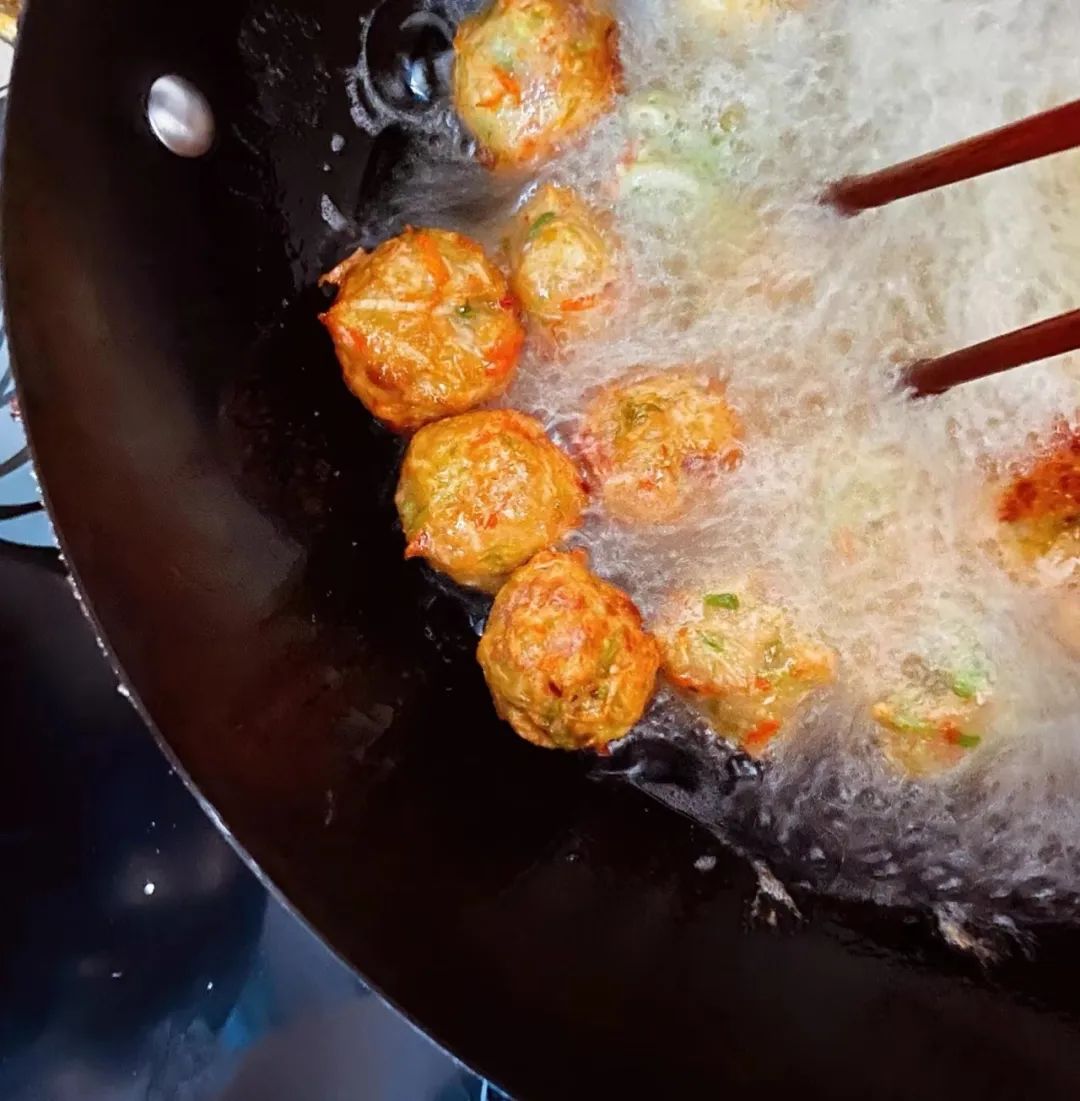 退休后,JRLEE在家里炸丸子。