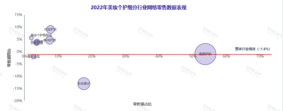 罗兴总结年度监测数据指出,2022年美妆个护线上同比下滑1.5%,销售额在全网份额占比9.5%,排名第四,次于服装服饰、家用电器品类。