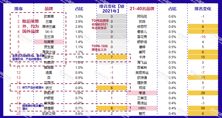 白皮书显示,2022年美妆个护头部企业格局基本稳定,TOP5格局未变,仍为欧莱雅、宝洁、雅诗兰黛、资生堂与LVMH。值得关注的是,本土企业珀莱雅、华熙生物崛起之势极为明显。
